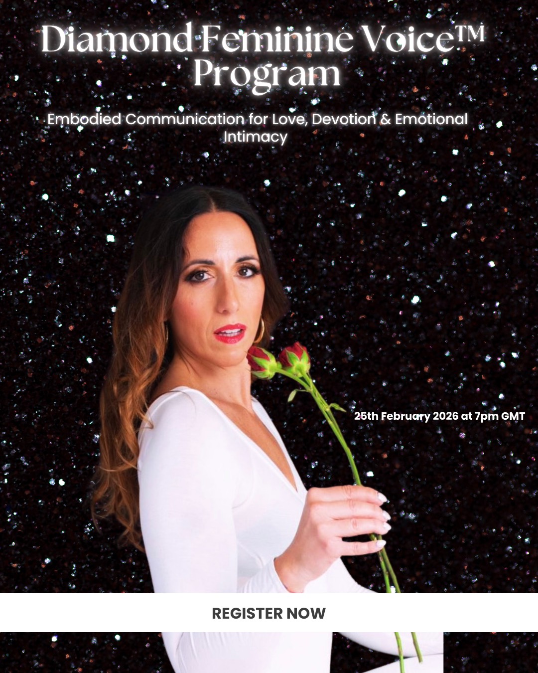The Diamond Feminine Voice™ is a 6 module feminine embodiment communication experience that teaches you how to express yourself from nervous system safety, feminine presence, and emotional truth, so men don’t just hear you, they feel you.